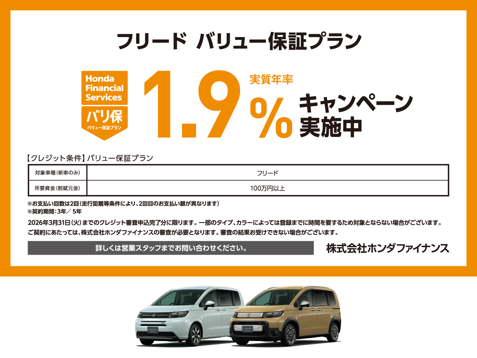 フリード バリュー保証プラン キャンペーン金利実施中! 2025.12.26 FREED ご購入プラン フリードが、バリュー保証プラン実質年率1.9%キャンペーン中でお買い時です。詳しくは営業スタッフまでお問い合わせください。◼️バリ保(バリュー保証プラン)について詳しくはこちら◼️フリードについて詳しくはこちら 2026年3月31日(火)までのクレジット審査申込完了分に限ります。一部のタイプ、カラーによっては登録までに時間を要するため対象とならない場合がございます。